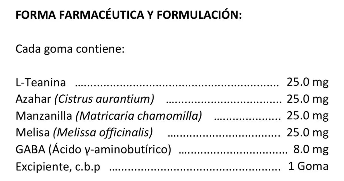 - Melatonina, manzanilla, toronjil (limoncillo), excipientes y sabor natural a uva.
